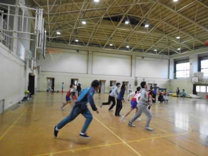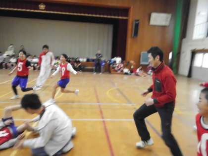 卒業を控えた6年生と教職員によるお別れ試合。体育館ではバレーボール部とバスケットボール部のお別れ試合が行われ,熱い戦いが繰り広げられました。教職員はみんな負けまいと全力を出しますが,体力が・・・。終わるころには,教職員チームはだいぶお疲れでした。