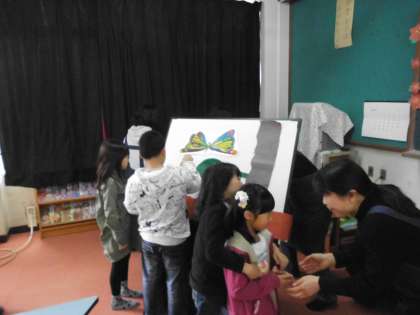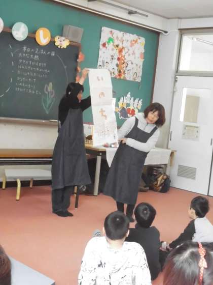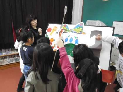 会の後,「はらぺこあおむし」の読み聞かせで使った道具を手に持たせてもらいました。1時間ほどの短い時間でしたが,本に触れるよい機会となりました。これを機会にまたたくさんの本を読み進めてほしいです。