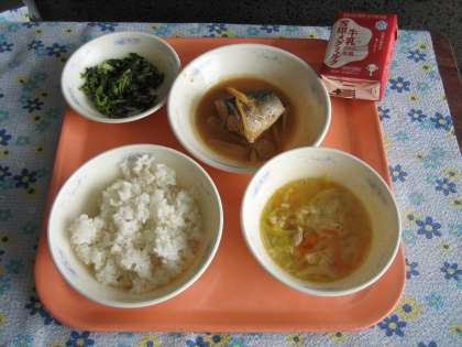 麦ごはん・牛乳・さばのみそ煮・だいこん葉のごまいため・キャベツの吉野汁