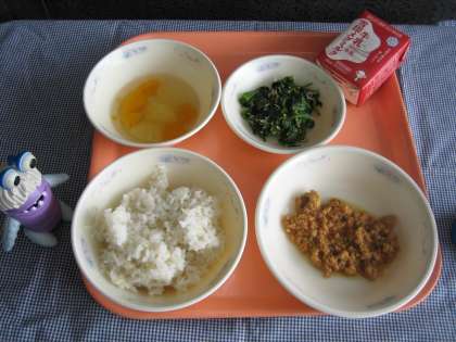 麦ごはん・牛乳・鶏そぼろ丼(具)・ほうれん草とじゃこのいためもの・フルーツ寒天