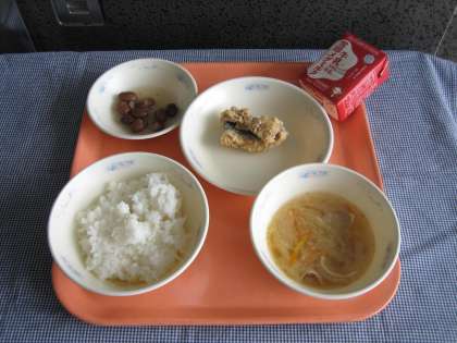 ごはん・牛乳・さわらのたつたあげ・金時豆の甘煮・豚汁