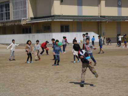 春の陽気の下、みんな元気に遊んでいます。ドッヂボールにおにごっこ、とにかく元気です。遊びを通して、新しい友だちともどんどん打ち解けていくのでしょうね。
