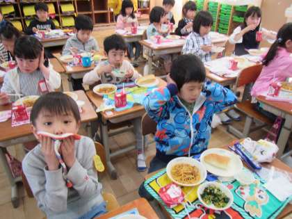1年生は初めての給食でした。エプロンを着け、初めての当番を一生懸命頑張っていました。そして、みんなで「いただきます!」「おいしい!」と言いながら食べてくれているのが印象的でした。
