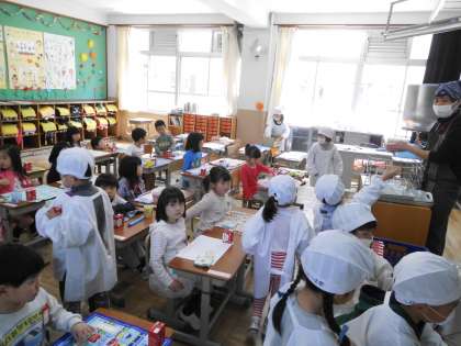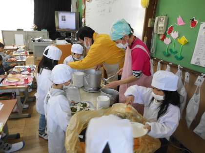給食当番は協力して,重たい食管や食器のかごを運んでいきます。そして,教室でみんなの分を配膳していきます。先生にも手伝ってもらいながら,頑張って用意を進めることができました。