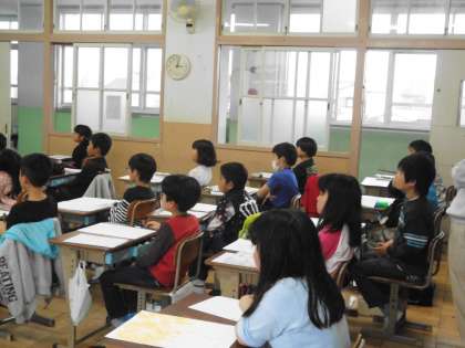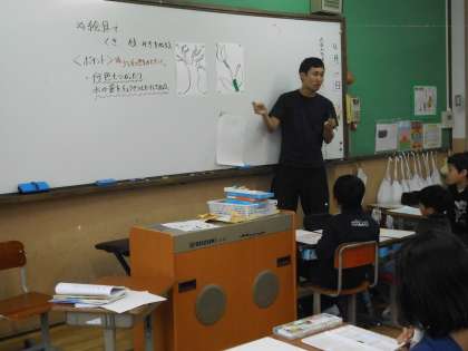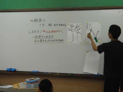 1組では,図工で,先日スケッチした春の草花に絵の具で色を付けていきました。まずは色を塗っていく際に気をつけることの確認です。先生が実際に見本を示しながら説明していきます。みんな真剣に先生の話を聞いています。先生の話を受けていい作品ができることだと思います。楽しみです。