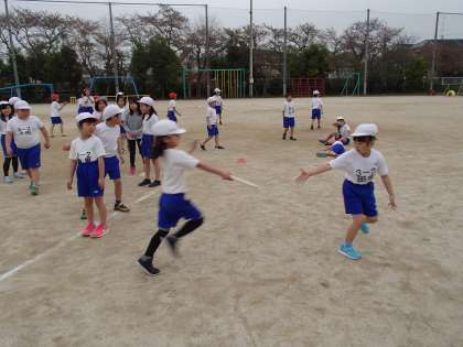 体育科ではリレーに取り組んでいます。前回はバトンパスの練習をしたので,今日はリードを教えてみました。グループ毎に声をかけあって,なかなか活気があります。