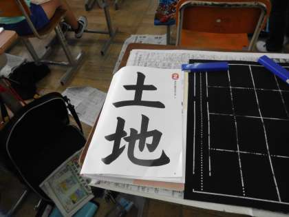 習字で『土地』を書きます。手本を見ながらいい字が書けるように集中して取り組みます。
