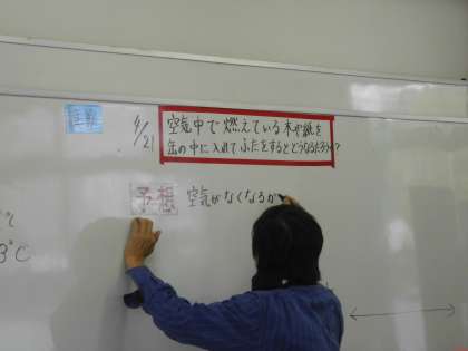 理科では,ものの燃え方について学習します。燃えている火はやがて消えてしまいますが,なぜ消えてしまうのか考えます。みんなで予想を出し合い,実験を通して調べていきます。またどんな結果になったか,わかったことを教えてくださいね。