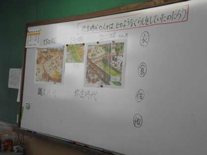 社会の歴史学習です。狩りの時代と米作りが始まった時代の生活を比べ,人々の生活がどのように変わったかを調べました。歴史学習では,歴史的事実を確認するとともに,その時代に生きた人たちの思いや願いについても考えていきます。昔と今がどのようにつながっているのか,また考えていきましょう。