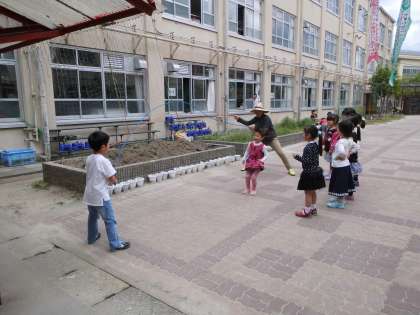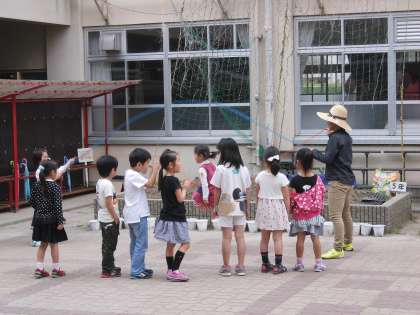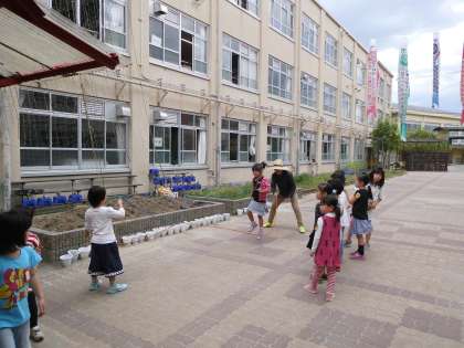 管理用務員さんがみんなにダブルダッチを教えてくれていますが,なんと1年生も並んで挑戦しています。でも,まだなかなかうまく跳べません。2年生たち上級生がやさしく跳ぶタイミングを教えてくれています。気づいたら跳べるようになっているのでしょうね。頑張れ!1年生!