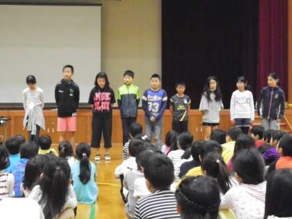 全校のみんなの前で,各クラスの代表委員と,高学年の児童会運営委員の紹介がありました。これから,各クラス,そして学校の中心になって活躍してくれるメンバーに,みんなであたたかい拍手をおくりました。