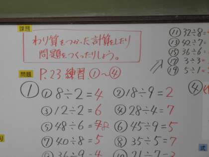 算数ではわり算の学習をしていますが,今日はこれまでの学習の復習です。3年生の算数で大切になってくるわり算。2年生で学習した九九をもとに,スムーズに計算できるようにこれからも練習ですね。