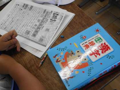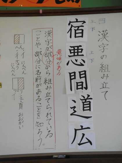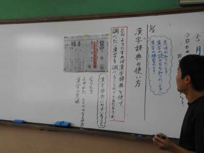 4年生は漢字辞典を使っての学習です。漢字辞典の使い方をみんなで確認しました。また,漢字がどのように組み立てられているのか,辞典を使って調べました。