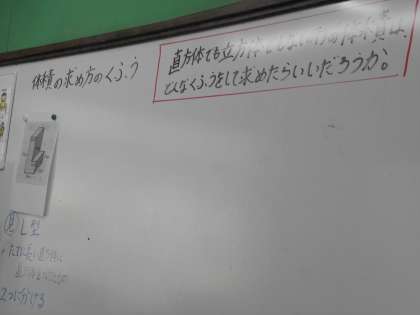算数で体積の学習をしています。今日は,体積を求める公式を使って,いろいろな形の立体の体積を求める方法を考えました。複雑な形でも,工夫していけば体積を求める公式を活用できることがわかりました。