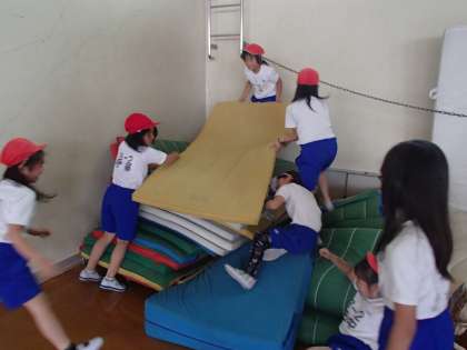 体育科ではマット運動に入りました。今日は子どもたちがどのくらい回転運動に親しんでいるか,自由にマットを回るように言いました。基礎感覚からしっかりとグループで話し合いながら自分なりの技を決めてほしいと思います。