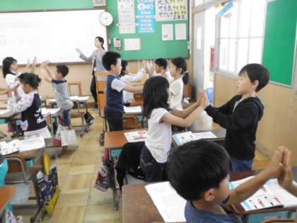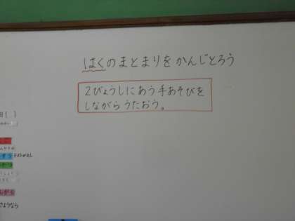音楽の学習で,先生の伴奏に合わせながらリズムにのって手遊びを楽しみました。友だちと顔を見合わせながらお互いに手を合わす表情は,みんなとても楽しげでした。リズムを体でしっかりと感じられたことだと思います。