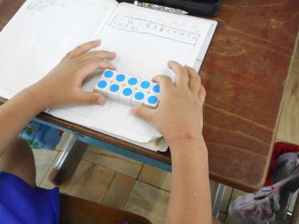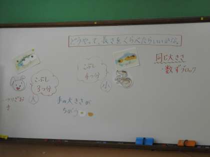 算数では「長さ」の学習に入りました。今日は最初の学習で,長さくらべをするにはどうしたらいいかをみんなで考えました。みんなで考えを出し合った後,数図ブロックなどを操作しながら長さくらべをしました。