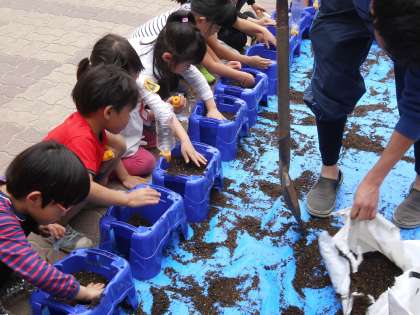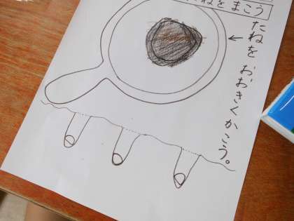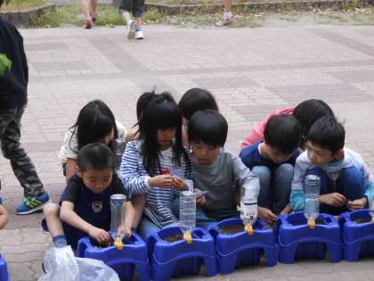生活科の学習で,アサガオの種を観察し,自分の鉢に植えました。観察は,小さい種を大きく描き,見て気づいたことを記録していきました。外に出て,先生から土を入れてもらって,種をまきました。