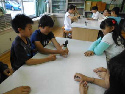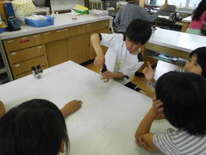 理科の「天気」の学習の発展で,自分たちで雲を発生させる実験をしました。自分たちの力で一生懸命に雲を作り出すことができ,歓声がおこっていました。