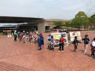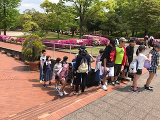 リトルワールドの中に入りました。まずは、石垣島の家の前でグループ写真撮影です。園内はツツジが満開です。さわやかな好天です。