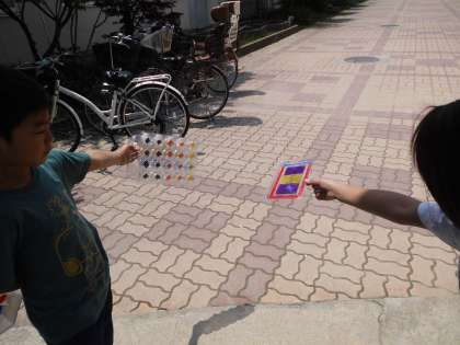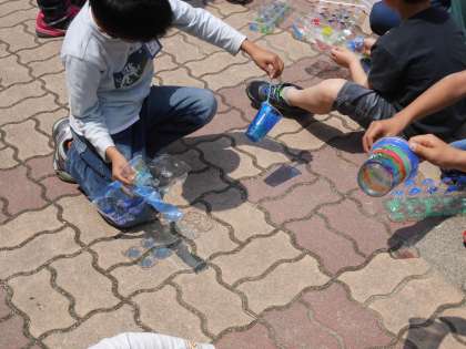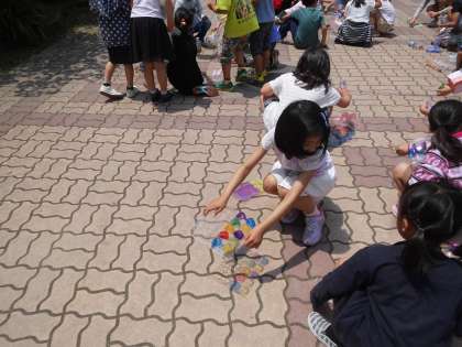 図工で「ひかりのプレゼント」の学習をしていますが,今日はいい天気なので,自分の作品を持って中庭に出てきて,実際に太陽の光を通してみました。カラフルな光がうつし出され,とてもきれいでした。