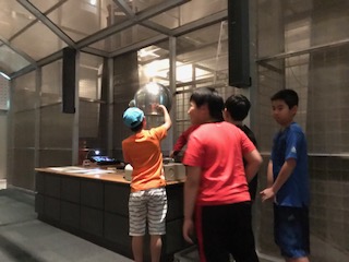 放電ラボでは静電気の体験をしました。その後、インタビューを受けました。ちくりとした感じがしたそうです。