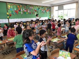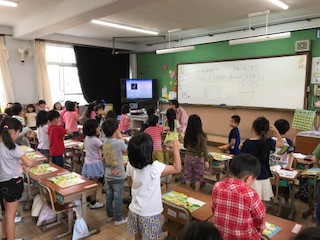 1年生は5時間目に1組のお友だちと2組のお友だちと合同で「1年生を迎える会」の練習を行いました。めあては,「『さんぽ』を元気に,笑顔で歌おう」です。手話を交えて,笑顔で歌いました。最後には,きれい声で歌えるように気をつけました。