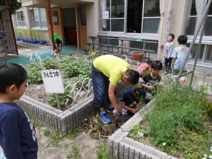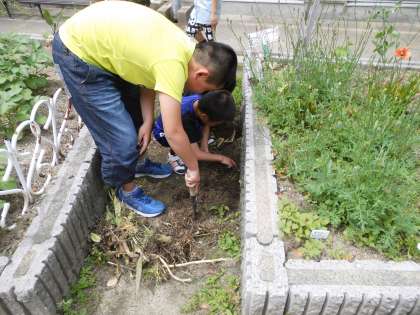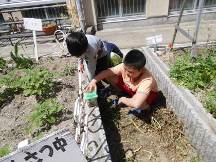 生き物大好きで,休み時間のたびに学校内のあちこちに生き物を探しにいきます。そして,生き物好きな1年生も一緒について行き,一緒に生き物探しです。とても楽しそうな光景です。