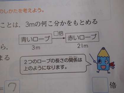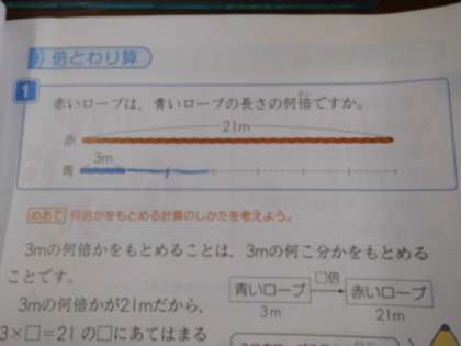 算数の学習です。「何倍かを求めるときにもわり算を使う」ということを今日の学習で学びました。また,関係図も新しく出てきました。関係図は,これから考えていく上で大切になってきます。しっかりマスターしたいです。