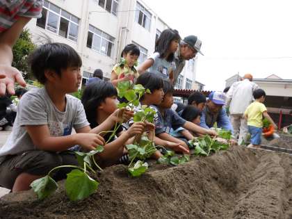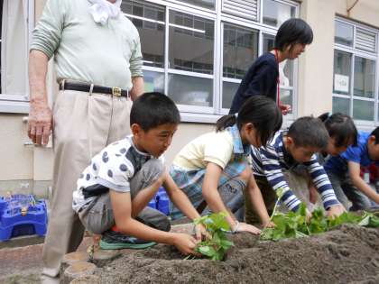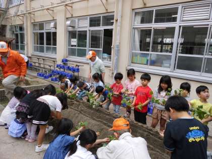 今日植えた苗は,2年生みんなでこれから世話をしていきます。水をやったり草を抜いたり,みんなで協力して大きなサツマイモを収穫できるようにしましょうね。