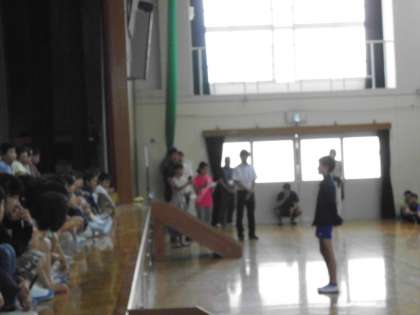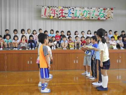 6年生に手をつないでもらって1年生が体育館に入場。あたたかい雰囲気で会がスタートしました。2年生から1年生にプレゼントがわたされ,運営委員の児童代表のあいさつがあり,その後は各学年からの発表です。