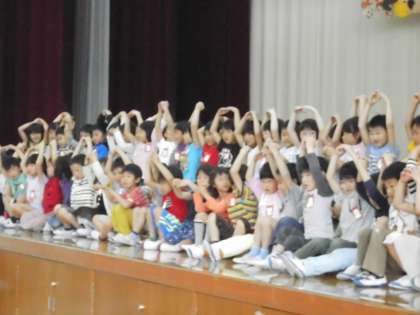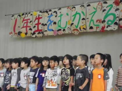 ○×クイズや全校合唱も行いました。必死にクイズに答える1年生,上級生と一緒になって歌う1年生。1年生も,すっかり梅津北小学校に仲間入りです。