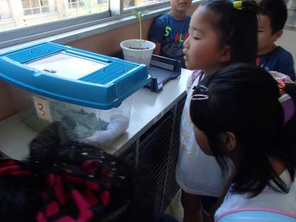 3年生の教室の前には,理科専科の先生が置いていってくれたモンシロチョウの幼虫がケージに入っているのですが,子どもたち朝来るとすぐにその変化に気づきました。ついにサナギに変身した幼虫,羽化の瞬間には立ち会えるでしょうか?