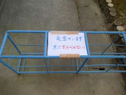 最近,校内でも毛虫が出るようになってきました。今,管理用務員さんの方で駆除を進めてくれています。コーンなどを置いて気をつけるように呼びかけています。みなさん,ご注意ください。