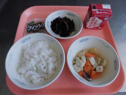 麦ごはん・牛乳・高野どうふと野菜のたき合わせ・ひじきの煮つけ・じゃこ