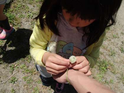 休み時間には理科で学習したシロツメクサを摘んでいる子がたくさんいます。教室の花瓶に活けてくれたり,教師の腕に巻いてくれたり。ちょっとしたふれあいにホッとする一日です。