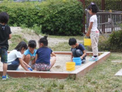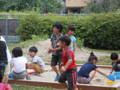 図工「すなやつちとなかよし」の学習です。ちびっこ広場の砂場で思い思いに造形遊びを楽しみます。スコップなども用意して,みんなとても楽しそうです。