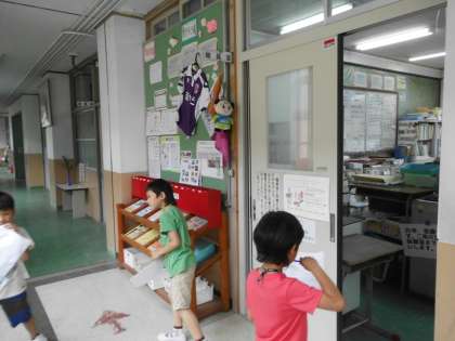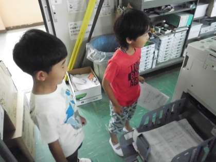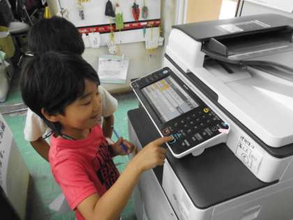 「職員室にはどんな機械があるか教えてください。」とやってきました。コピー機や印刷機,拡大コピー機などたくさんの機械があることを教頭先生から教えてもらいました。