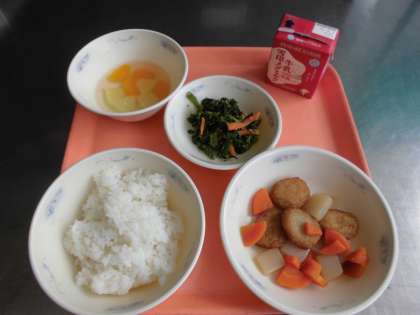 ごはん・牛乳・平天の煮つけ・ほうれん草のごま煮・フルーツ寒天