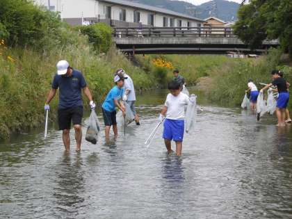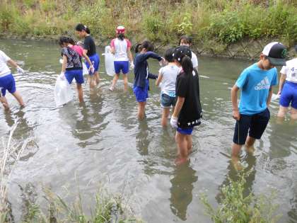 4〜6年生の高学年は,実際に有栖川に入っての清掃活動です。地域や保護者の方々と一緒にたくさんのごみを拾いました。