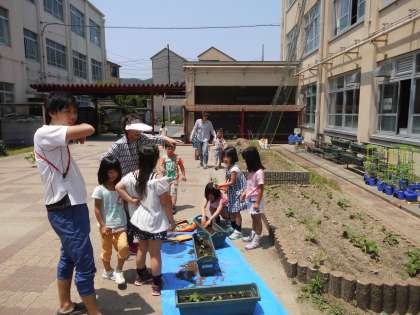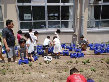 1年生はアサガオの芽がたくさん出てきたので,間引いてプランターにまた新しく植えなおしました。今日も暑い一日なので水やりも忘れません。みんな大事にアサガオを育てています。