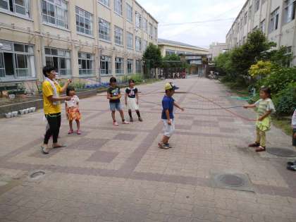 1年生もダブルダッチをリズミカルに跳べるようになってきました。丸太を使って「ドンじゃんけん」も楽しんでいます。そして,竹馬も練習しています。できるようになったらまた教えてくださいね。