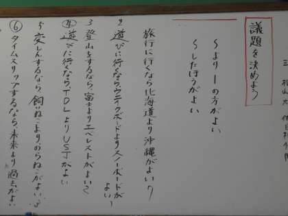 1組では,どんな議題で学級討論会を開くか話し合いました。討論会は,肯定派と否定派,それぞれの立場をはっきりさせた上で討論を進めていきます。どんな討論会になるのでしょうか。また討論会の様子をのぞいてみたいです。