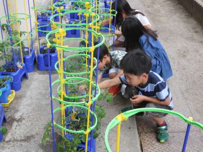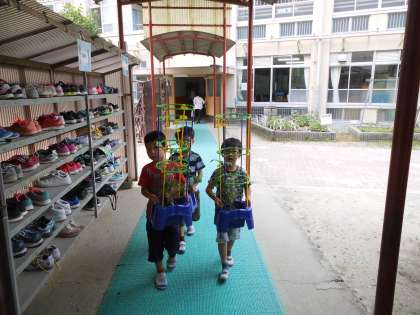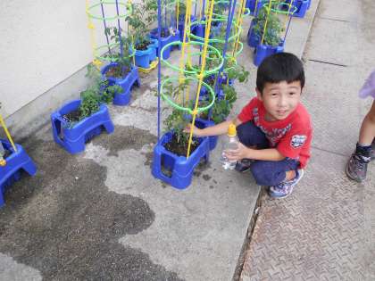 ミニトマトを生活科で育てていますが,大きくなって早くも実をつけ始めています。今日はどれだけ大きくなったか観察しました。そして,水やりも忘れません。