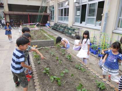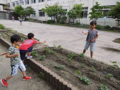 ミニトマトと一緒に,サツマイモのお世話も忘れていません。自分が植えた苗を覚えていて,しっかりとお世話しています。これからもお世話,よろしくね。