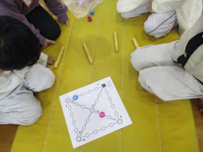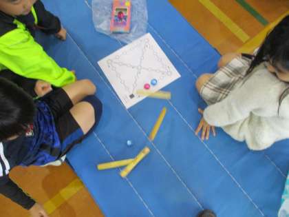 朝鮮半島の遊びである「ユンノリ」をしました。日本で言うすごろくに近い遊びで、子どもたちは大喜びで遊んでいました。