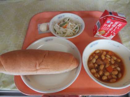 全粒粉パン、牛乳、ポークビーンズ、じゃがいものソテー、チーズ
