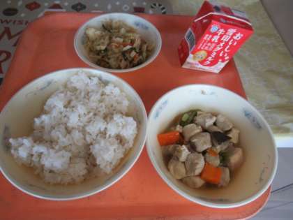 麦ごはん、牛乳、高野どうふと野菜のたきあわせ、ごま酢煮