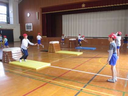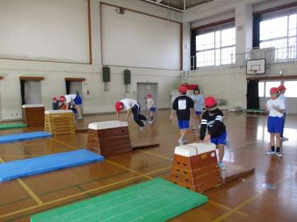 体育科では「とび箱」の学習が始まりました。はじめの時間は、準備や体慣らしの方法を知り、安全に気をつけて、ねらい1(自分のできるわざで高さのちがうとび箱にちょう戦する)の学習をしました。