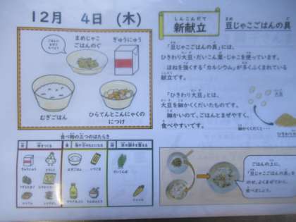 麦ごはん、牛乳、豆じゃこごはん、平天とこんにゃくの煮つけ